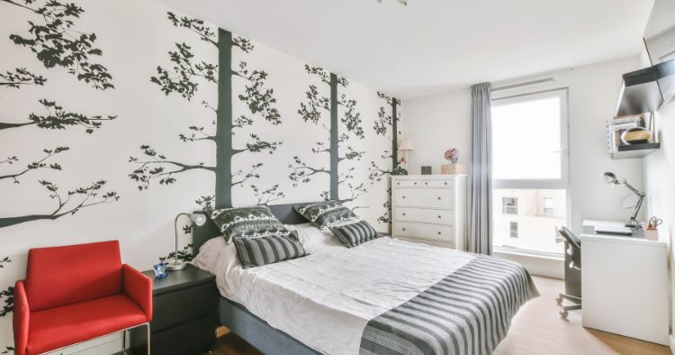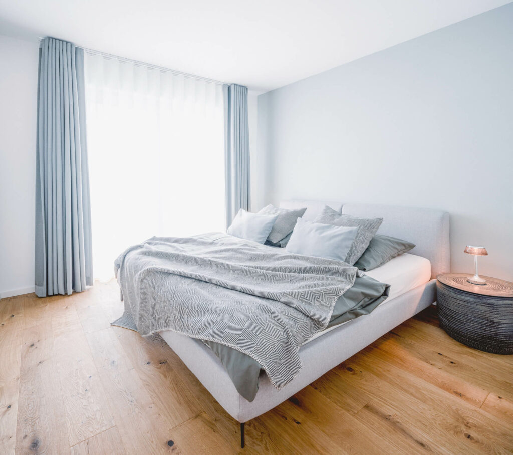 - Beruhigende Farben: Da das Schlafzimmer ein Raum zum Entspannen und Ausruhen ist, wählen Designer oft hochwertigste Tapeten in beruhigenden Farben wie Blau, Grün oder Beige. Diese Farben schaffen eine ruhige und entspannte Atmosphäre, die für einen guten Schlaf förderlich ist.